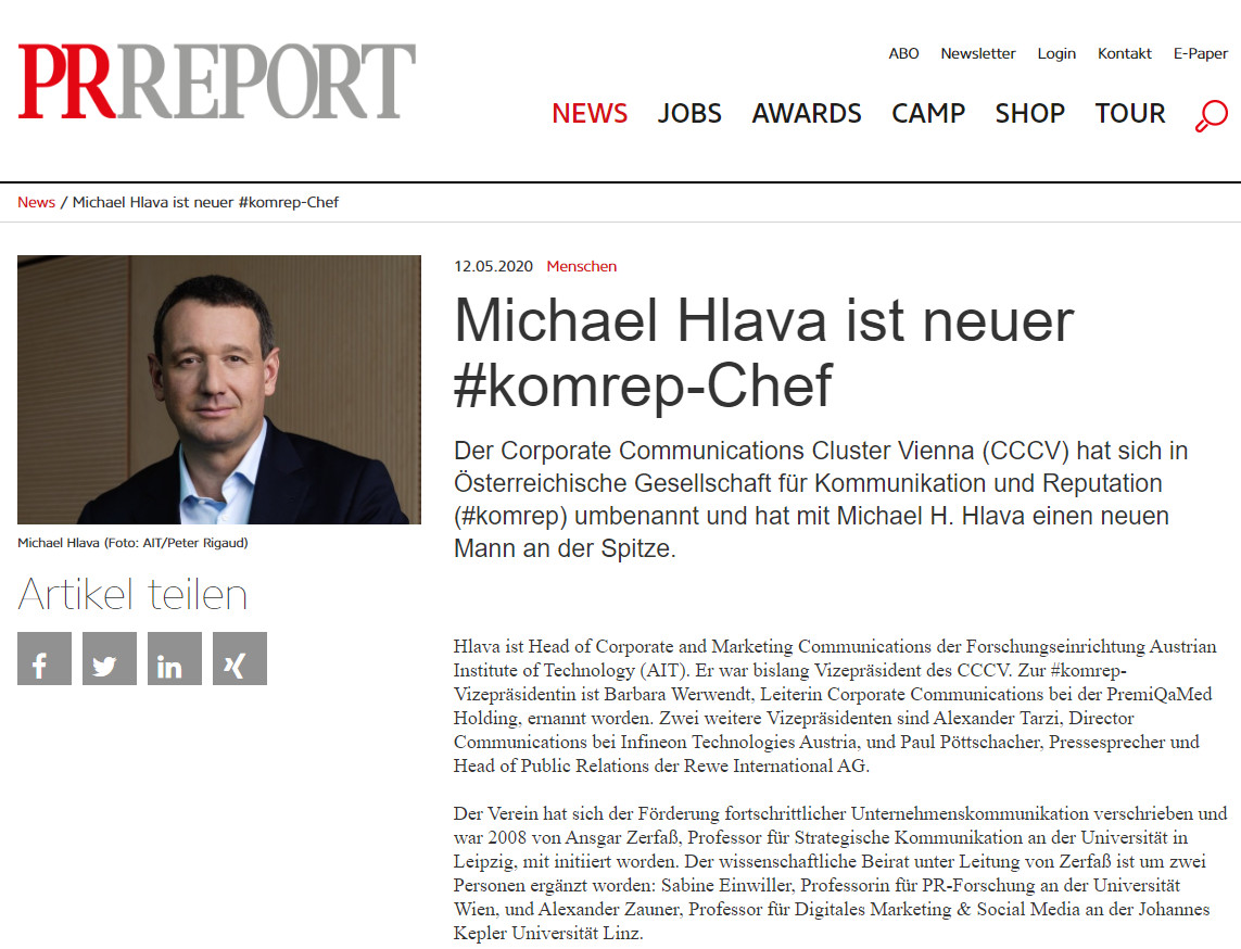 Zum neuen Vorsitzenden wurde Michael H. Hlava gewählt. Hlava ist Head of Corporate and Marketing Communications bei AIT Austrian Institute of Technology. Vizepräsidentin ist Barbara Werwendt, Leiterin Corporate Communications bei der PremiQaMed Holding. Zwei weitere Vizepräsidenten sind Alexander Tarzi, Director Communications der Infineon Technologies Austria AG mit Sitz in Villach und Paul Pöttschacher, Pressesprecher und Head of Public Relations bei der REWE International AG. „Die Weiterentwicklung unseres Fachgebietes ist uns allen ein besonderes Anliegen. Vor allem auch die Erweiterung unserer Expertise rund um Reputation mit den besten Expert*innen des Landes“, sagt der neue Vorsitzende Michael H. Hlava